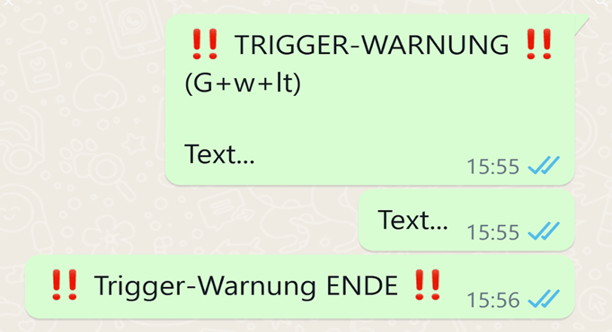 Bei Wechsel der Trigger-Themen innerhalb von Gesprächen, ist jedes neue Thema mit einer erneuten Trigger-Warnung (inkl. neuem Hinweiswort!) zu versehen.
